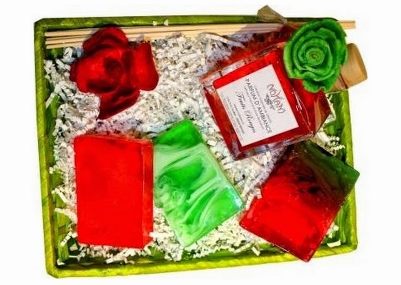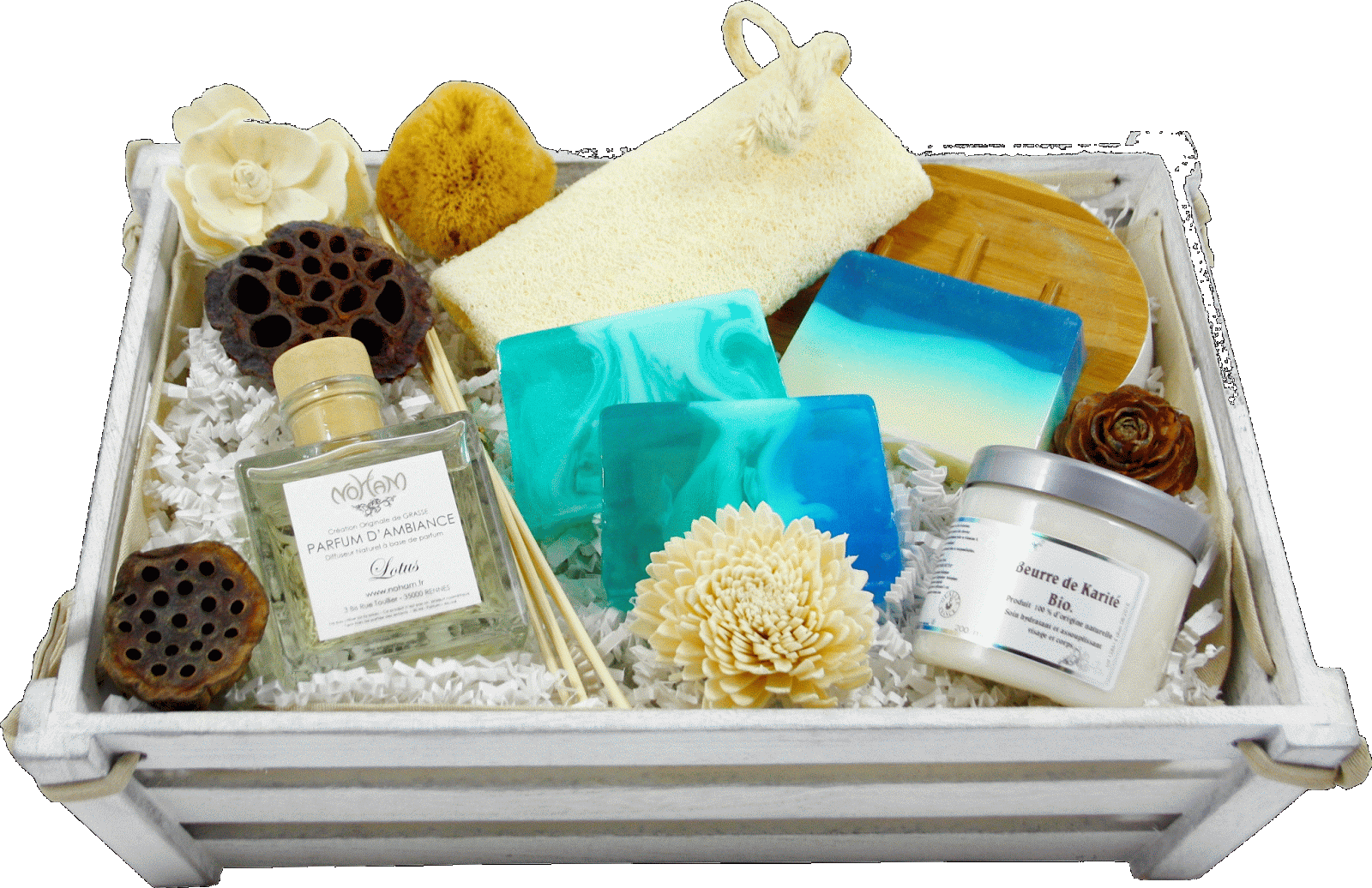 Composition : 1 diffuseur Parfums ambiance, 3 savons à la coupe, 1 beurre de Karité, 1 panière en bois, décorations