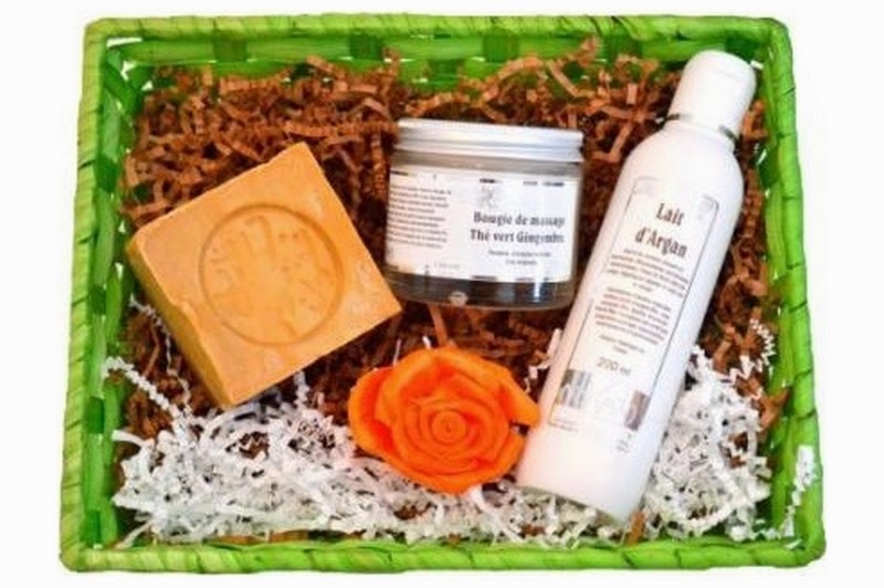 Composition : 1 Lait d'Argan, 1 bougie de massage, 1 savon d'Alep, 1 panière bambou, décorations